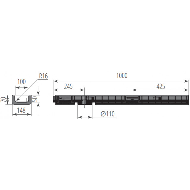 Мелкосидящий дренажный пластиковый - лоток Norma Plastik с шириной гидравлического сечения 100 мм (DN100), с высотой 70 мм (H70) применяется для многоуровневых паркингов, частных домовладений, пешеходных и проезжих зон с небольшой площадью водосбора, для оборудования эксплуатируемых кровель.