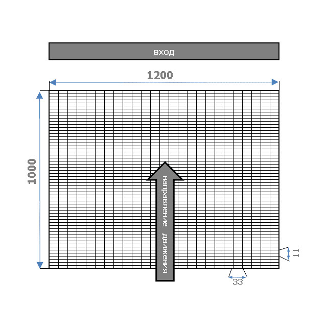 Металлические придверные решетки 1х1,2 м. должны располагаться таким образом, чтобы основной трафик движения пешеходов был направлен по длине ячейки 11 мм. В этом случае система работает более корректно, а момент скольжения по настилу будет менее ощутим.