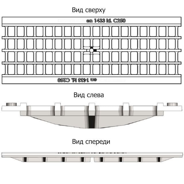 Как правило, такие чугунные решетки устанавливаются в местах со средней интенсивностью движения, например, пешеходные зоны, АЗС или гаражи, стоянки автотранспорта, т.е. там, где нагрузка на поверхностный водоотвод не превышает класс C250 (до 25 тонн на метр квадратный.