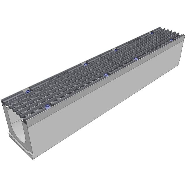 Начинает серию литьевых каналов из бетона - лоток водоотводной Super шириной гидравлического сечения 100 мм и высотой по наружным отметкам 165 мм, в комплекте с чугунной решеткой высокой прочности. Конструкция специально разработана для участия в комплексном использовании систем поверхностного водоотвода при строительстве дорог. Достаточно толстые боковые стенки желоба (32,5 мм) позволяют лотку комфортно переносить воздействие тяжелых нагрузок. Полезная высота канала (100 мм) открывает неплохие показатели пропускной способности к естественной разуклонке 0,5% или 5 мм на 1 погонный метр длины лотка - 2,7 л/сек.